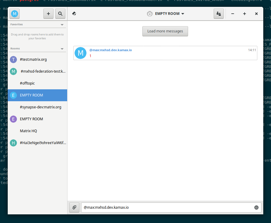 Lots of excitement at the variety of independent clients and servers able to interact over the matrix protocol. The images above show The Construct (server) and gomuks (client), and then mxhsd and Fractal. A fundamental part of matrix is to be an open protocol, so it's great to see entirely independent implementations liaising together! While implementing mxhsd, Max has been documenting spec omissions in a branch of the spec - we're hoping he will contribute these back!